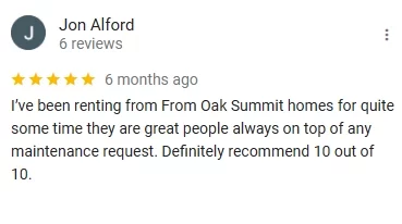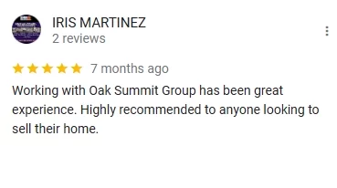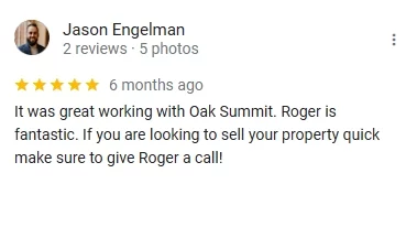 Roger with Oak Summit Group was able to complete the purchase of my home with everything from contract to closing completed exactly as discussed and expected. This was after I had been run around and deceived by several other home buyers, one of which defaulted twice on two contracts. I am extremely thankful to have been able to sell my home to Roger!!!!